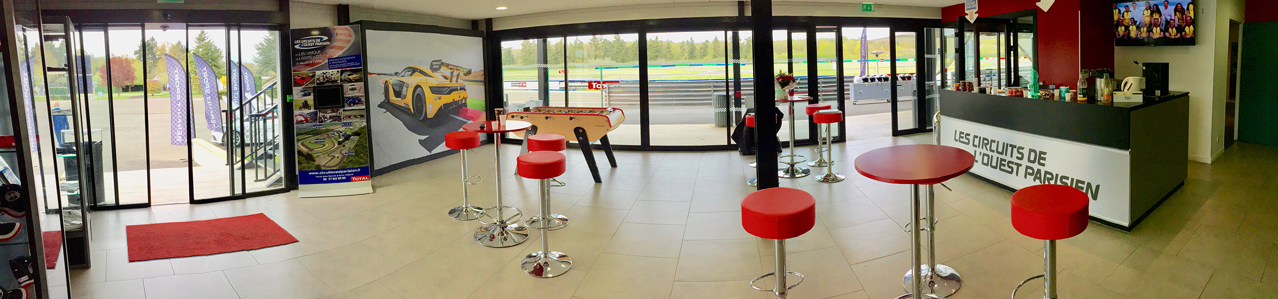 Cet espace réceptif multifonctionnel se trouve en bordure du circuit asphalte sur deux niveaux. Le rez-de-chaussée de 70 m² permet d’accueillir les groupes de clients dans un cadre convivial et moderne, avec un accès direct à la pitlane.